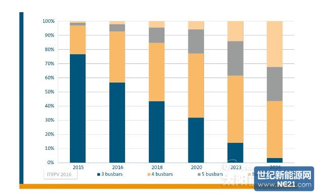 ITRPV预计到2018年,4根母线电池互连技术市场份额将超过3根母线,5根母线设计市场占比也在提升。
