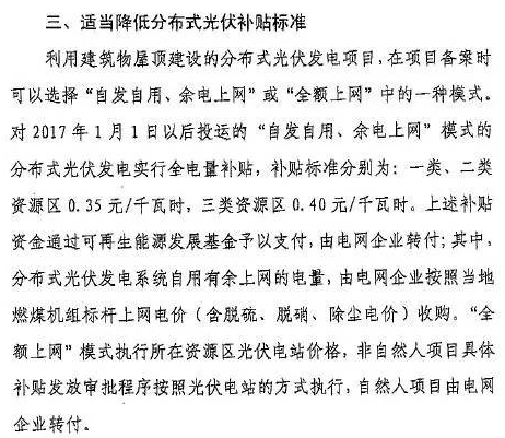 根据意见函,此次征求意见稿将分布式光伏的补贴标准由之前的“一类资源区0.2元/千瓦时、二类资源区0.25元/千瓦时、三类资源区0.3元/千瓦时”调整为“一类、二类资源区0.35元/千瓦时,三类资源区0.40元/千瓦时”,而地面电站维持不变。