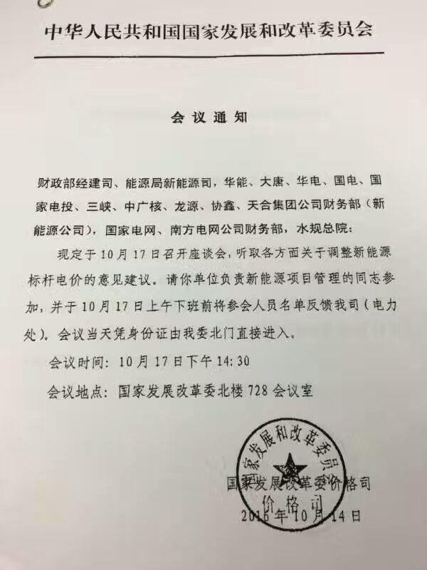 发改委价格司组织财政部能源局协鑫天合等参加调整新能源标杆电价座谈会