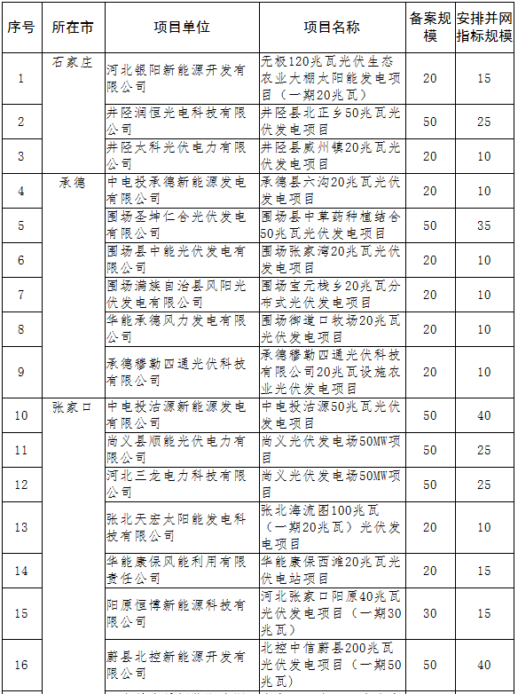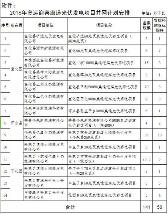 14个项目并网 电价降低0.03元 河北省2016年奥运迎宾廊道光伏发电项目并网计划安排情况公示