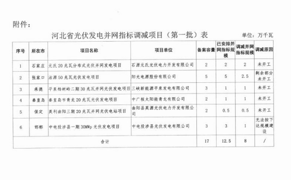 6个项目共调减8万千瓦 河北发改委关于调减光伏发电项目并网计划(第一批)的通知