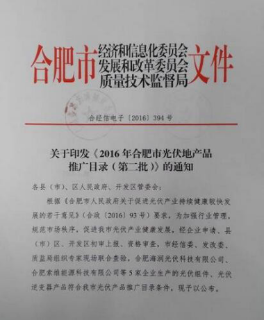 10月28日,合肥市经信委、发改委以及质监局联合发布《2016年合肥市光伏地产品推广目录(第二批)》的通知。