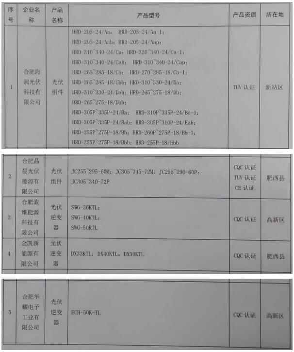安徽合肥市发布2016年第二批光伏地产品推广目录