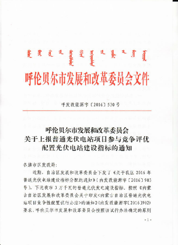呼伦贝尔发改委公布普通光伏电站项目参与竞争评优配置建设指标的通知