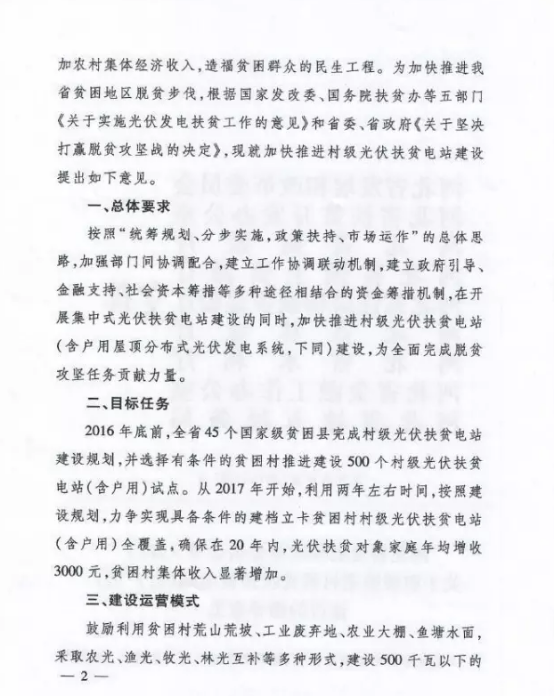 按照"省级统筹、县负总责,统一规划、分步实施,政策扶持、合力推进"的总体思路,建立政府补助、社会帮扶、金融支持、用户出资等多途径相结合的资金筹措机制,大力推进光伏扶贫工程实施,有效増加贫困村集体经济收入和贫困户家庭收入,加快扶贫对象脱贫致富步伐,充分发挥光伏扶贫的产业带动作用和社会综合效益.