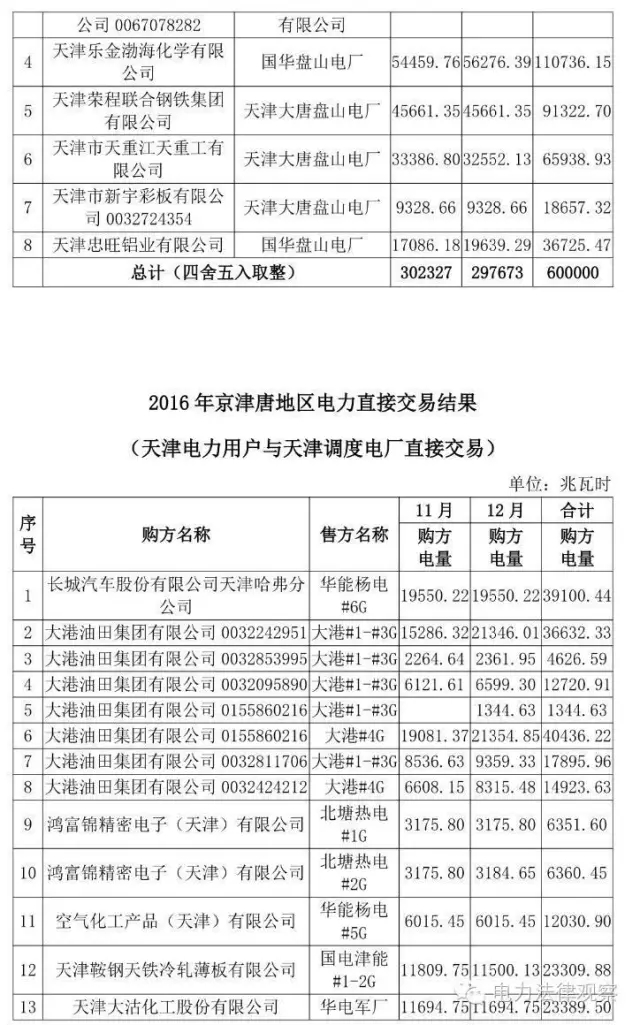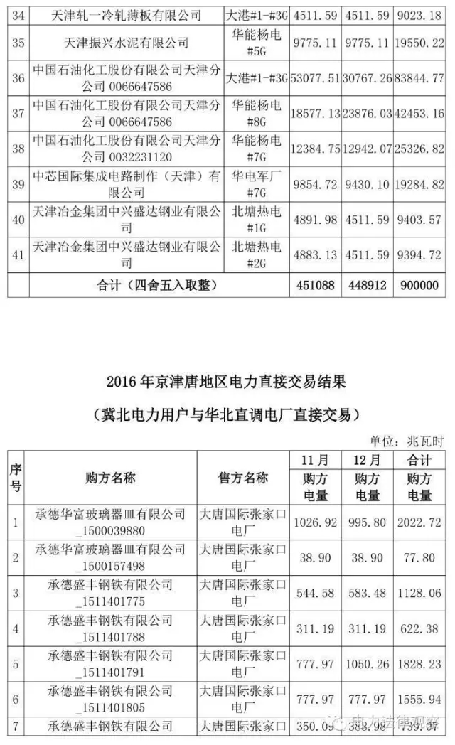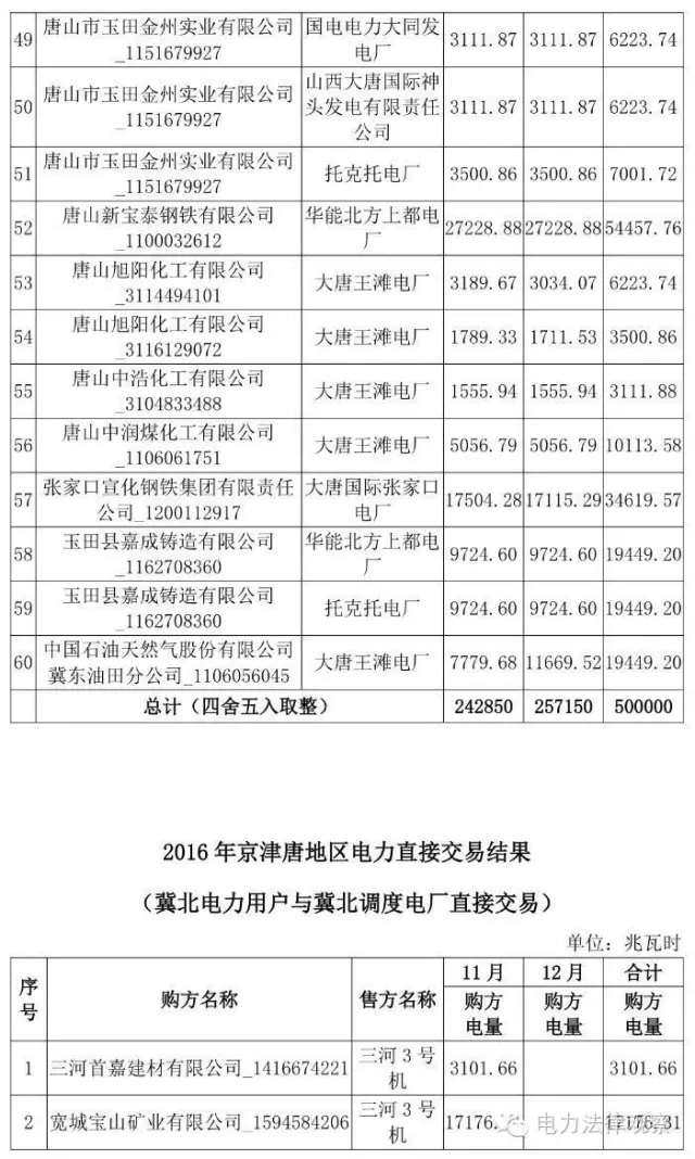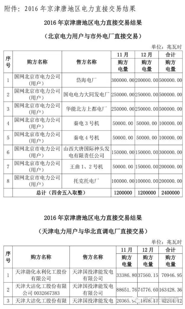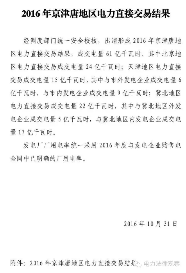 观茶君获得的落款为2016年10月31日的文件显示:京津唐地区电力直接交易结果已经新鲜出炉,共成交电量61亿千瓦时。其中,北京24亿千瓦时,天津15亿千瓦时,冀北22亿千瓦时。