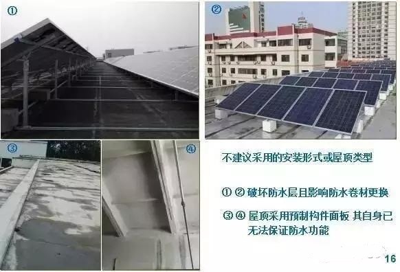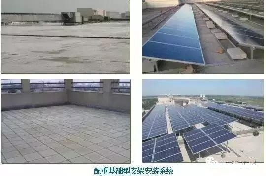 这个方案是这是第三类,刚才的是属于浇筑混凝土形式。在现有的建筑立,这是非常容易见到的。常规屋顶的上面有防水,也有保护层,但开始建造的时候没有考虑安装光伏系统。第一种是外表面是混凝土的保护层,下面是贴的是屋顶的瓷砖。这两种安装方式是配重基础加支架,这种安装方式要找其他地方重新计算载荷,实现起来也比较简单。