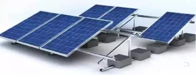 平屋顶的结构选型可根据屋顶完成面的实际做法,选择相应的支架系统。支架系统一般由立柱、基 础 、斜梁与横梁四部分构成。电池组件通过紧固件与横梁实现连接。(重量: 0.35~0.50kN/㎡)