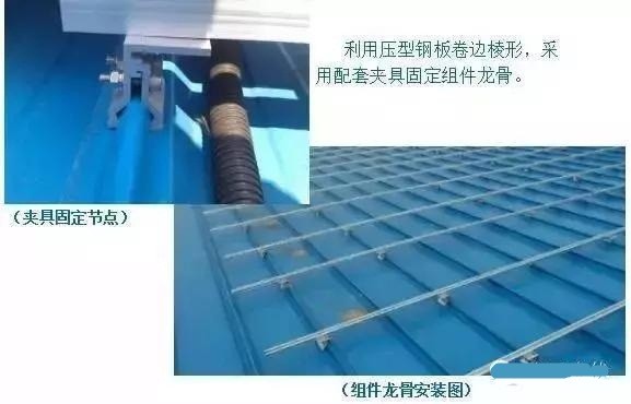 彩钢瓦一般是家庭工厂或者是大型工业厂房使用。它的安装方式和坡屋顶的区别就在于支座的安装方式不一样。彩钢屋顶是彩钢版上面有个夹具,夹在上面做支撑。它的作用是安装角度是顺着屋顶坡度安装,如果在屋顶的结构承载力可以满足的情况下,可以把倾角翘起来,加大安装角度。常见的屋面板系统立边咬合、直立锁边系统、压型钢板系统(单板或夹芯)。