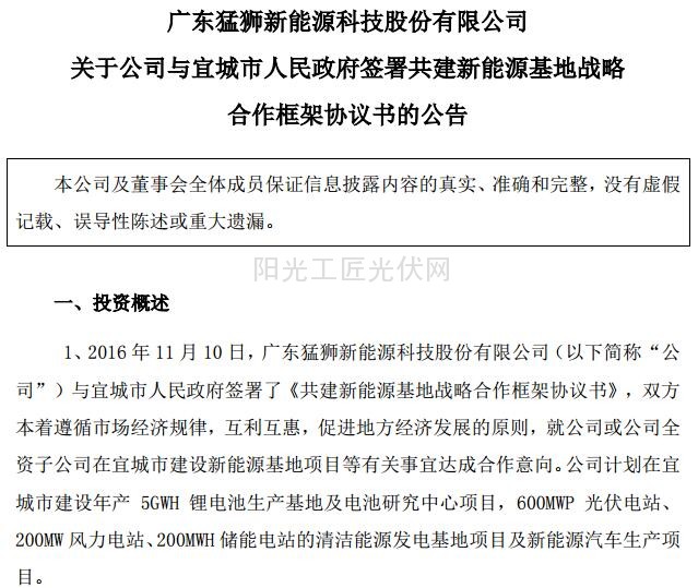 来源:楚江都市报发布时间:2016-11-13 23:59:59 11月12日,参与起草锂离子动力电池国家标准的广东猛狮新能源科技股份有限公司发布公告,投入30亿元用20个月时间在宜城市建成年产500万千瓦时锂电池生产基地和新一代电池研发中心。未来5年内,还将投入58亿元,分批分期建设