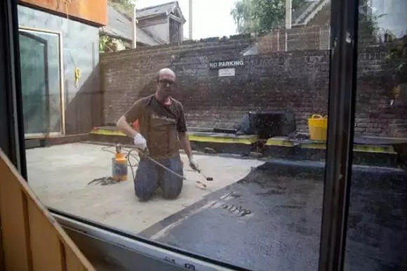 在院子里抹个地面,Tim要跪下来伸着脖子做,一定要非常非常平整才可以,小公主们可以光着脚丫跑。