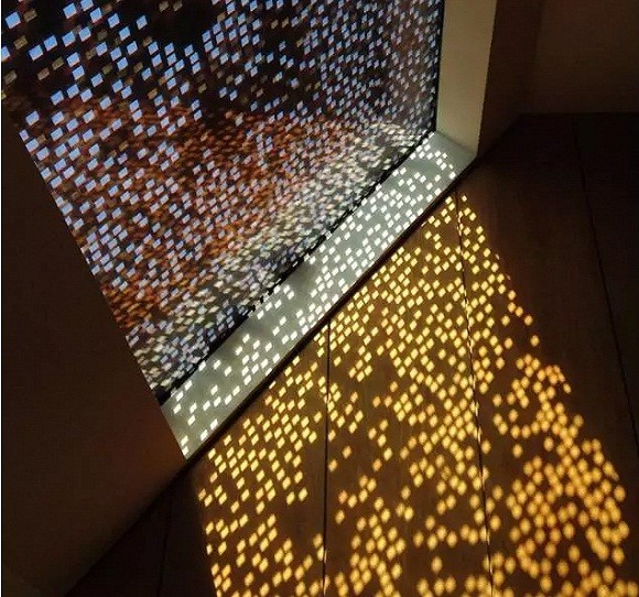 下一页>铁皮的屋顶太压抑,结结实实地盖在头顶上,感觉透不过气来。Tim动了点小聪明,在上面钻了一些细密的小方孔,屋顶一下子轻盈了很多。有阳光的日子里,光瀑布倾泻而下。