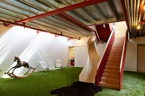 原来还有地下室!而且地下室早铺好了草坪,滑梯口放了厚厚的毛毯,不用担心玩太开心屁股遭殃。这是Tim妻子的奇思妙想,Tim真给实现了。女儿们再也不走楼梯了。