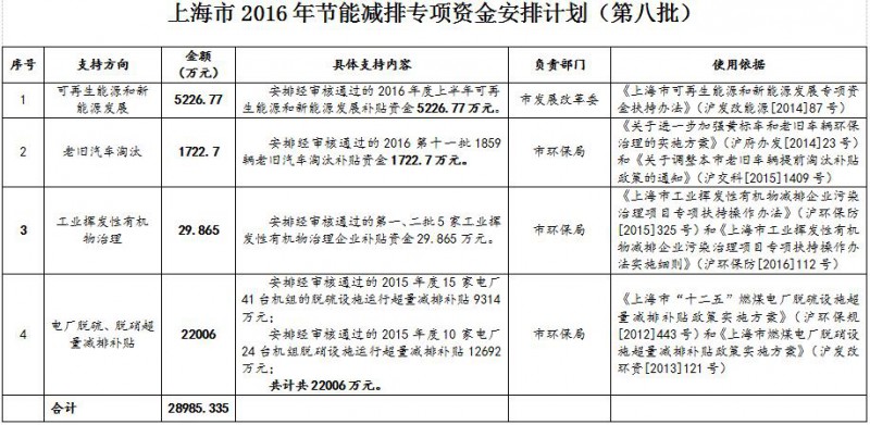 近日,上海发布《关于下达本市2016年节能减排专项资金安排计划(第八批)的通知》,通知显示第八批节能减排资金将下发至市环保局。以下为通知主要内容: