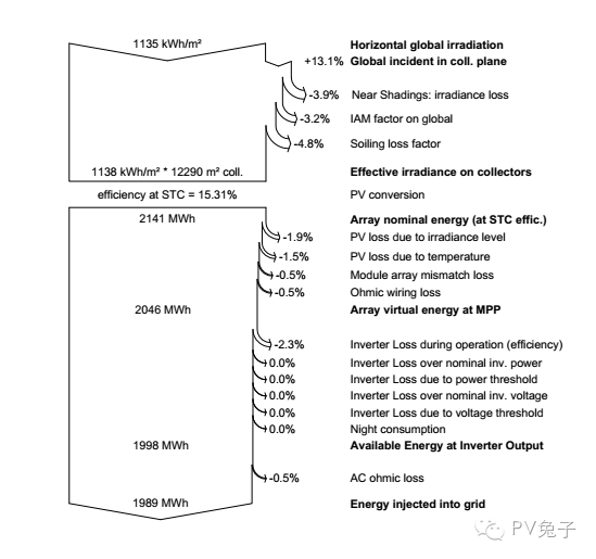 附上pvsyst中对电站模拟的电量损失图,里面形象的描述了发电量损失的主要方面和具体发电量的计算逻辑。供大家参考