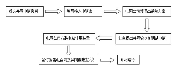 分布式项目业主在准备好相关资料后向电网公司地市或县客户报务中心提交接入申请,客户服务中心协助项目业主填写接入申请表,接入申请受理后在电网公司承诺的时限内,客户服务中心将通知项目业主确认接入系统方案,项目建成后业主向客户服务中心提出并网验收和调试申请,电网企业将完成电能计量装置安装,购售电合同及调度协议签订,并网验收及调试工作,之后项目即可并网发电。