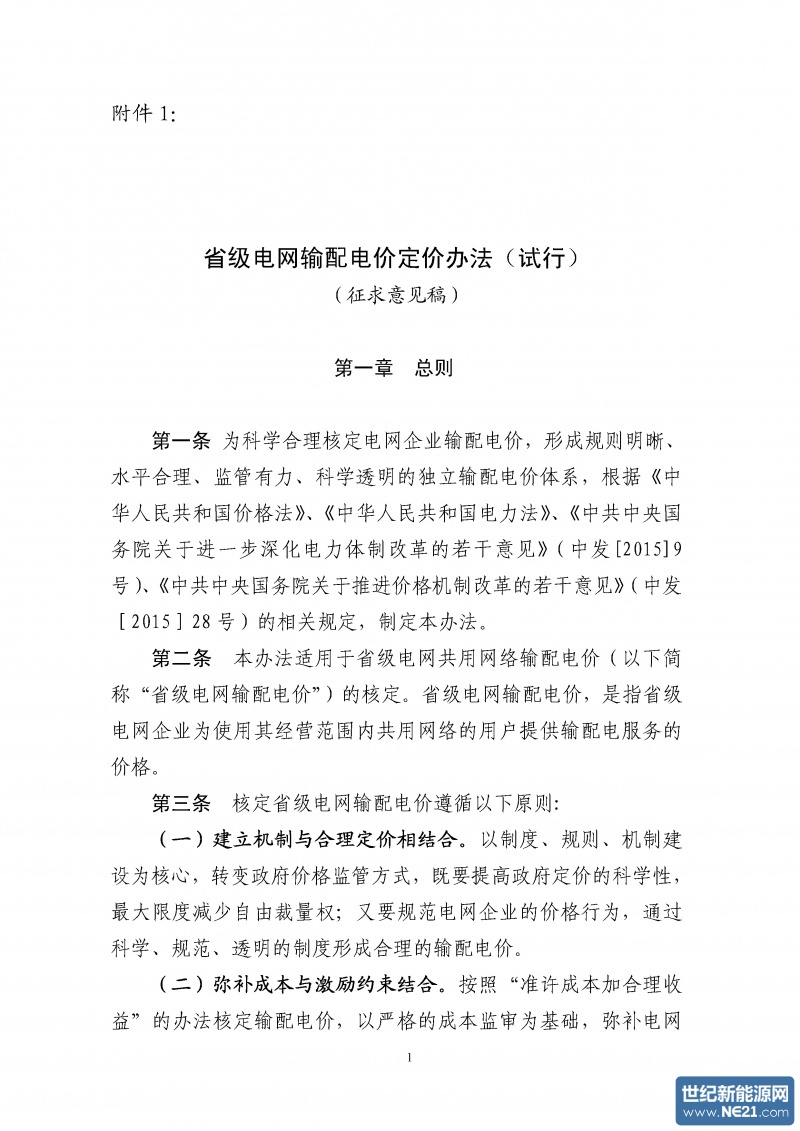 1、《省级电网输配电价定价办法(试行)》(征求意见稿)