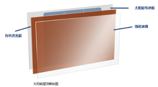 从特斯拉官网公布的结构图来看,太阳能屋顶瓦片由一层彩色透光膜覆盖一块高效太阳能电池板,最外层是强化玻璃。强化玻璃“负责”对各种温度、物体撞击的耐受力,有色透光膜”负责”透光和视觉美观,太阳能电池板”负责”转化太阳能。