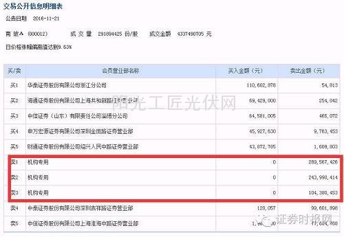 11月21日盘后的龙虎榜数据显示,登上当日卖方龙虎榜前三的全部为机构席位,3家机构合计卖出6.38亿元,占到南玻A当日成交金额的14.7%。