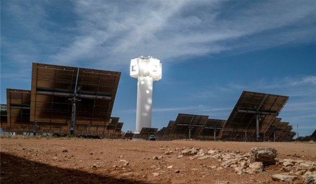 经过技术的进一步改进,目前该电站在日落后也可以供电2到3小时的电力。该电站集热塔高约为205米,总共安装了约4160套定日镜系统,单套定日镜采光面积为140平方米,总采光面积约576800平方米。它们能够跟踪太阳的运动轨迹,将太阳光线反射到到集热塔上,吸热器内的水受热产生蒸汽,从而驱动汽轮机转动产生电能。