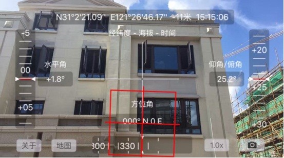经纬仪始终指北,有刻度显示,显示用户面向,以当前用户站立时手机方面为准;