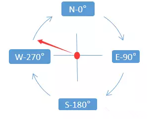 正向方位角标记为:如274°N,即顺时针偏离正北方274°;正向方位角最大度数为360°;