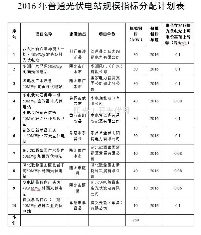 按照《国家发展改革委国家能源局关于完善光伏发电规模管理和实行竞争方式配置项目的指导意见》(发改能源〔2016〕1163号)、《国家能源局关于下达2016年光伏发电建设实施方案的通知》(国能新能〔2016〕166号)要求,我局委托湖北省工程咨询公司组织开展了2016年普通光伏电站竞争比选工作,经公示、复核后,公布了竞争比选结果。按照统筹兼顾,综合平衡的原则,经省能源局局长办公会议研究决定,现将2016年普通光伏电站规模指标分解下达,并就有关事项通知如下: