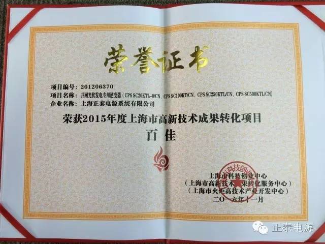 11月8日由上海市科技创业中心、东方财经·浦东频道共同主办的“2016上海高新技术成果转化百佳年会”在兰馨·悦立方圆满举行。会议发布了《2015上海高新技术成果转化年度报告》,正泰电源系统“并网光伏发电专用逆变器”项目入选新能源领域高新技术成果转化百佳奖项。