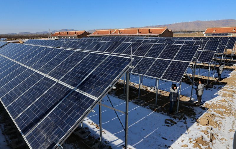 11月23日,电力工人在阳原县“光伏小镇”双庙村检查光伏发电板支架的紧固情况。