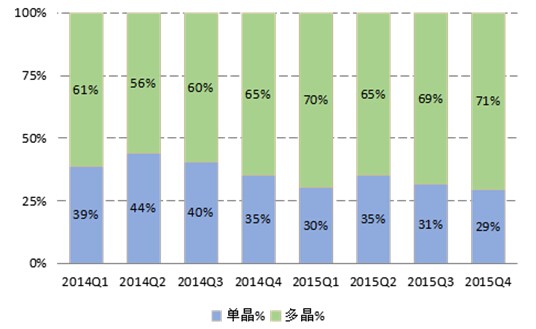 来自日本光伏产业协会(JPEA)的数据显示,2015年,多晶产品继续成为日本光伏市场的主导。2015年,日本市场单晶需求量为2288兆瓦,多晶需求量为4988兆瓦,单晶占总体的比例仅为31.4%,比2014年又下滑了8个百分点。按季度来看,单晶需求量占比总体上呈现下滑的态势,并在去年四季度创下29%的新低。实际上,近年来,日本市场的单晶产品需求量一直处于下滑的趋势,而且都是多晶占主导。2014年,全年多晶需求量占比为60.6%,单晶也是逐季下滑。