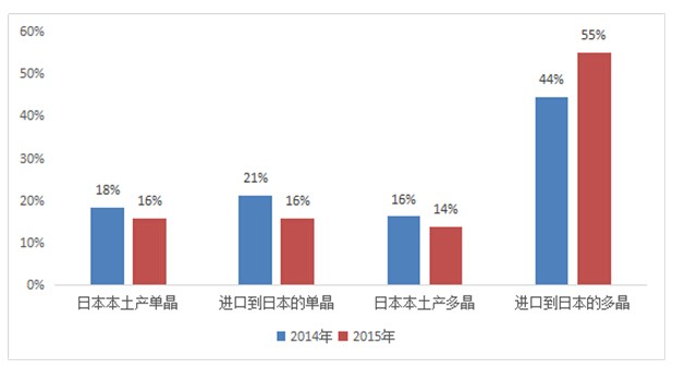 图2.日本市场2014-2015年组件来源构成多晶产品主导了日本光伏市场,而且比例正在逐渐加大,这与我们传统上对日本市场的认知不同。此前的观点认为,日本因为国土面积原因,将会重点发展分布式光伏,而分布式光伏又将以单晶产品为主。从上述数据看来,以上看法并不成立。