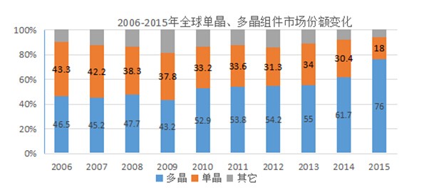 同样是EnergyTrend的统计数据,2015年全球太阳能需求量为53吉瓦,其中单晶总产出约为9.5吉瓦,占比为17.9%。日本市场的单晶产品市占率与全球市场的市占率情况较为一致。