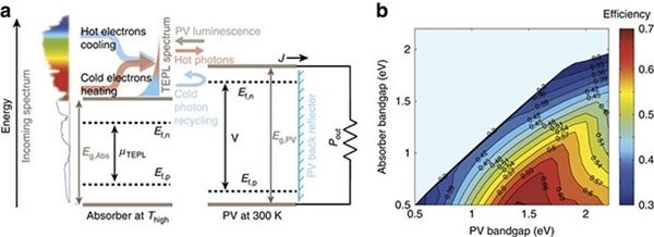通过这种方式,便可将光能和热能转化电能。实验结果显示,这种材料可将传统的太阳能电池效率提高至50%。