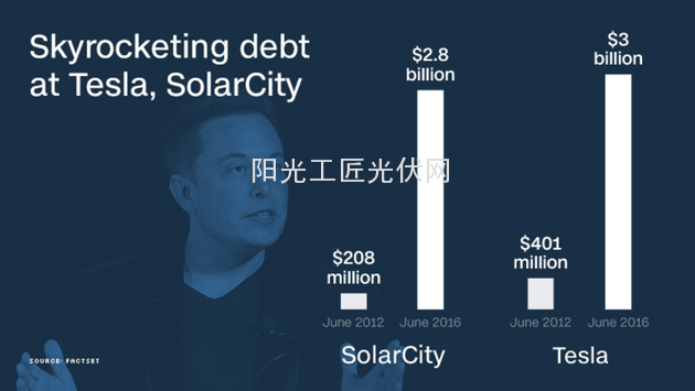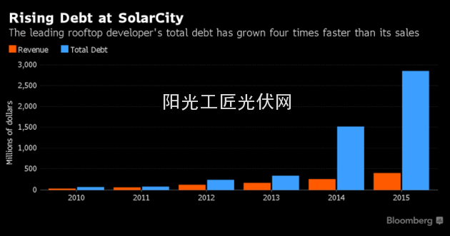 而根据另一份由彭博社总结出的数据表格显示,SolarCity的所欠下的债务可谓是指数级增长——而这种债务的急剧增长是整个公司整体销售额增长速度的四倍之多。