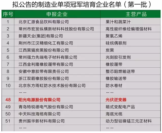 阳光电源入围首批制造业单项冠军示范(培育)企业公示名单