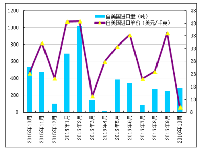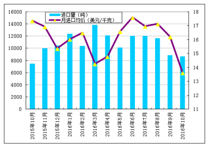 第四,进口月均价创历史新低。10月份进口月均价下滑至13.63美元/千克,环比下降16.0%,同比降幅为21.5%。主要是自美国和韩国进口月均价齐创历史新低,其中美国月均价下滑至10.02美元/千克,环比大幅下跌74.5%,同比下降56.9%,从韩国进口月均价下滑至12.13美元/千克,环比下降17.8%,同比下跌19.9%。