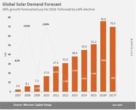 2017年全球太阳能需求前景并没有像预期那样放缓,反而有所改观。由于组件价格的下滑导致中国出现反弹,预计将会有下一轮关税削减。
