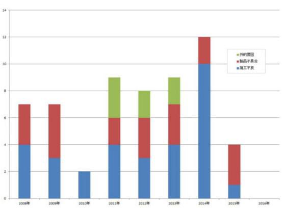 在登记的102起事故中,目前已有58起推测出了原因(图2)。分类为“施工不合格”、“产品不合格”、“外部原因”。