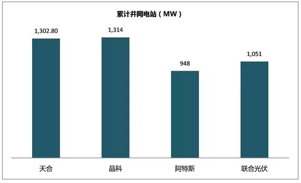 截至2016年9月末,天合光能累计并网电站1302.8MW,其中中国1,267.6 MW、美国4.2 MW、欧洲31.0 MW。中国并网的1267MW电站中有250. 5分布式项目。