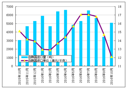 2016年1-10月份累计从韩国进口多晶硅量为54581吨,同比增加32.4%;累计进口均价14.80美元/千克,同比下滑11.9%