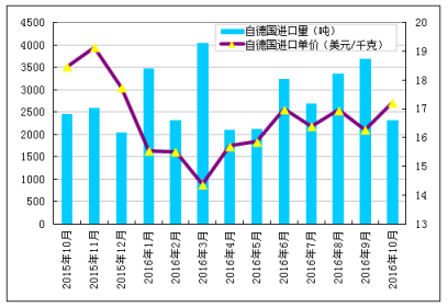 2016年10月份从德国进口多晶硅量为2328吨,环比减少37.0%;10月份进口单价上涨至17.22美元/千克,环比增幅为5.8%。
