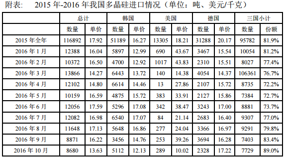 表:2015年-2016年我国多晶硅进口情况(单位:吨、美元/千克)