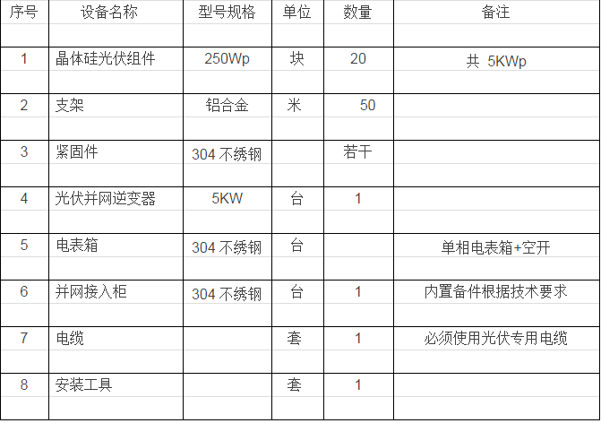 1)、项目拟使用 250Wp 多晶体硅光伏组件,共 20 块,光伏组件必须为知名厂商生产的成熟产品并获得相关认证;