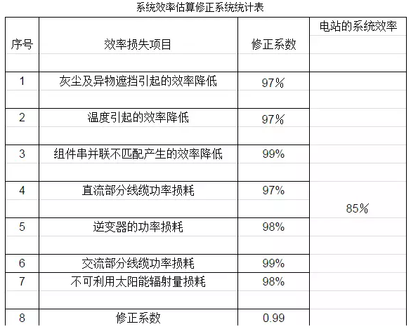 本工程设计系统效率修正为 85%,并以此数据进一步估算光伏电站的年发电量。