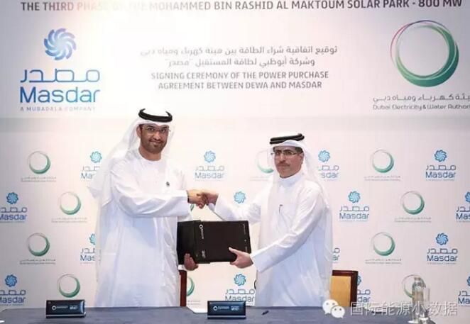 索比光伏网讯:2016年11月29日,迪拜电力和供水机构(DEWA)与阿布扎比未来能源公司(Masdar)正式签署了迪拜(Mohammed bin Rashid Al Maktoum Solar Park)光伏园第三期800兆瓦项目的购电协议,成交价格为0.299美分/千瓦时,创全球历史上最低的光伏价格。