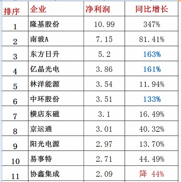 光头君盘点发现,和营收增长同步,隆基股份净利润同比增长也是“最牛”,达到347%,遥居榜首。东方日升、亿晶光电、中环股份的表现也算可圈可点。