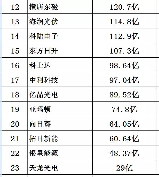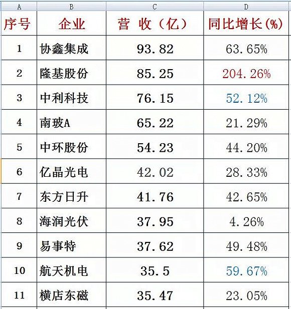 23家企业中,协鑫集成营收最牛,达到93.83亿元,隆基股份紧随其后达到85.25亿元,比较“打眼”的是,其同比增长竟然达到204.26%。天龙光电排在最后,营收增长同比为“负”。