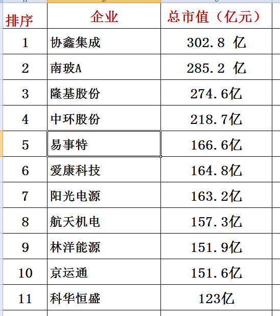 光头君盘点发现,A股上市企业中,协鑫集成是唯一一家市值超过300亿元的光伏企业。A股有超过15家企业市值超过100亿元。