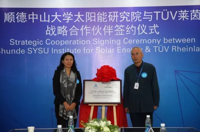 TÜV莱茵广东分公司首席营运官姜宏女士与顺德中山大学太阳能研究院院长沈辉教授