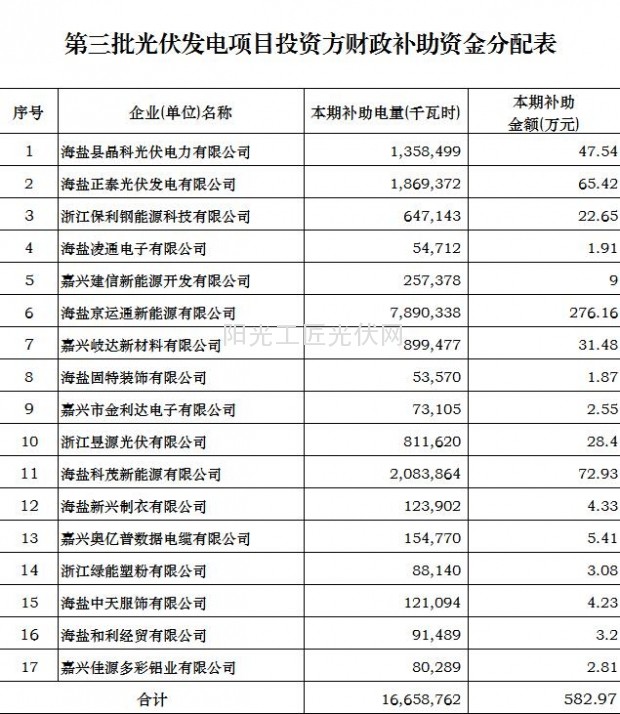 为促进我县光伏产业健康发展,根据《海盐县人民政府 关于印发〈2016年海盐县推进光伏发电应用实施方案〉的通知》(盐政发〔2016〕22号)精神,依照县财政局《海盐县企业财政性扶持资金管理办法》(盐财企〔2016〕1号)规定,经审核本次共有17家企业符合补助条件,报经县政府同意,现拨付第三批光伏发电项目投资方财政补助资金582.97万元(详见图),资金列专用基金“工业发展资金”支出。